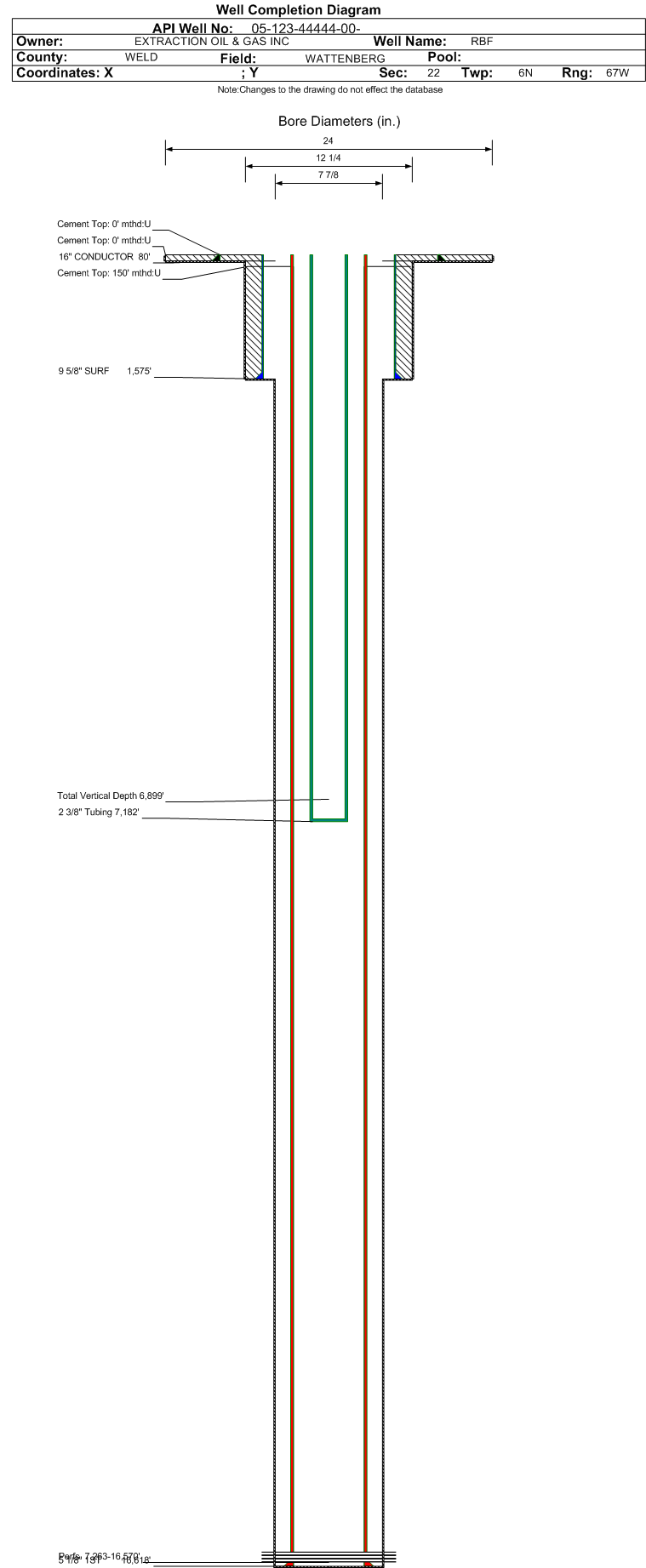 | Wellbore Completed | | Completion Date: | 4/14/2017 | | Spud Date: | 3/30/2017 | Spud Date Is: | ACTUAL | | Measured TD: | 16630 ft. | Measured PB depth: | 16614 ft. | | True Vertical TD: | 6899 ft. | True Vertical PB depth: | 6899 ft. | | Top PZ Location: | Sec:22 Twp: 6N 67W | Footage: 2499 FNL 507 FEL | | Bottom Hole Location: | Sec:21 Twp: 6N 67W | Footage: 2492 FNL 520 FWL | | Log Types: | CBL, Mud, MWD, (Triple Combo on 123-44440) | | Casing: | String Type: CONDUCTOR, Hole Size: 24 in., Size: 16 in., Top: 0 ft., Depth: 80 ft., Weight: 42 , Citings Type: ACTUAL | | Cement: | Sacks: 100, Top: 0 ft., Bottom: 80 ft., Determination Method: VISU | | Casing: | String Type: SURF, Hole Size: 12.25 in., Size: 9.625 in., Top: 0 ft., Depth: 1575 ft., Weight: 36 , Citings Type: ACTUAL | | Cement: | Sacks: 625, Top: 0 ft., Bottom: 1575 ft., Determination Method: VISU | | Casing: | String Type: 1ST, Hole Size: 7.875 in., Size: 5.2 in., Top: 0 ft., Depth: 16618 ft., Weight: 20 , Citings Type: ACTUAL | | Cement: | Sacks: 2675, Top: 150 ft., Bottom: 16618 ft., Determination Method: CBL | | Formation | Interval Top | Log Bottom | Cored | DSTs | | PARKMAN | 3562 ft. | | N | N | | SUSSEX | 4102 ft. | | N | N | | SHANNON | 4653 ft. | | N | N | | SHARON SPRINGS | 7079 ft. | | N | N | | NIOBRARA | 7170 ft. | | N | N |