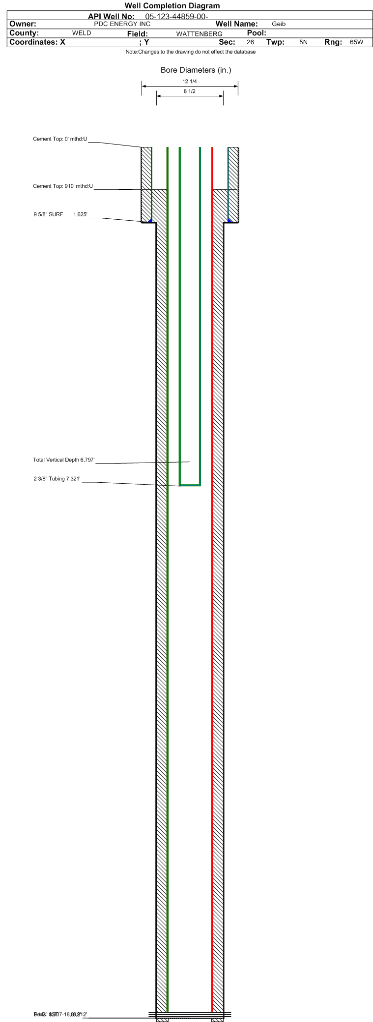 | Wellbore Completed | | Completion Date: | 5/5/2018 | | Spud Date: | 4/26/2018 | Spud Date Is: | ACTUAL | | Measured TD: | 18893 ft. | Measured PB depth: | 18797 ft. | | True Vertical TD: | 6797 ft. | True Vertical PB depth: | 6800 ft. | | Top PZ Location: | Sec:25 Twp: 5N 65W | Footage: 2199 FNL 88 FWL | | Bottom Hole Location: | Sec:27 Twp: 5N 65W | Footage: 2223 FNL 52 FWL | | Log Types: | CBL, MWD (DIL in 123-32111) | | Casing: | String Type: SURF, Hole Size: 12.25 in., Size: 9.625 in., Top: 0 ft., Depth: 1625 ft., Weight: 36 , Citings Type: ACTUAL | | Cement: | Sacks: 740, Top: 0 ft., Bottom: 1625 ft., Determination Method: VISU | | Casing: | String Type: 1ST, Hole Size: 8.5 in., Size: 5.5 in., Top: 0 ft., Depth: 18812 ft., Weight: 20 , Citings Type: ACTUAL | | Cement: | Sacks: 2715, Top: 910 ft., Bottom: 18893 ft., Determination Method: CBL | | Formation | Interval Top | Log Bottom | Cored | DSTs | | PARKMAN | 3773 ft. | | | | | SUSSEX | 4538 ft. | | | | | SHARON SPRINGS | 7024 ft. | | | | | NIOBRARA | 7162 ft. | | | |