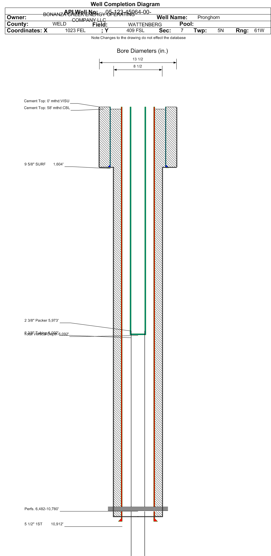 | Wellbore Completed | | Completion Date: | 12/9/2018 | | Spud Date: | 11/22/2018 | Spud Date Is: | ACTUAL | | Measured TD: | 10922 ft. | Measured PB depth: | 10866 ft. | | True Vertical TD: | 6092 ft. | True Vertical PB depth: | 6092 ft. | | Top PZ Location: | Sec:18 Twp: 5N 61W | Footage: 484 FNL 1923 FEL | | Bottom Hole Location: | Sec:18 Twp: 5N 61W | Footage: 461 FSL 1958 FEL | | Log Types: | CBL, Mud, MWD/LWD, (Resistivity on 123-45062). | | Casing: | String Type: SURF, Hole Size: 13.5 in., Size: 9.625 in., Top: 0 ft., Depth: 1604 ft., Weight: 36 , Citings Type: ACTUAL | | Cement: | Sacks: 720, Top: 0 ft., Bottom: 1604 ft., Determination Method: VISU | | Casing: | String Type: 1ST, Hole Size: 8.5 in., Size: 5.5 in., Top: 0 ft., Depth: 10912 ft., Weight: 17 , Citings Type: ACTUAL | | Cement: | Sacks: 1580, Top: 58 ft., Bottom: 10912 ft., Determination Method: CBL | | Formation | Interval Top | Log Bottom | Cored | DSTs | | PARKMAN | 3128 ft. | | | | | SHARON SPRINGS | 6022 ft. | | | | | NIOBRARA | 6290 ft. | | | |