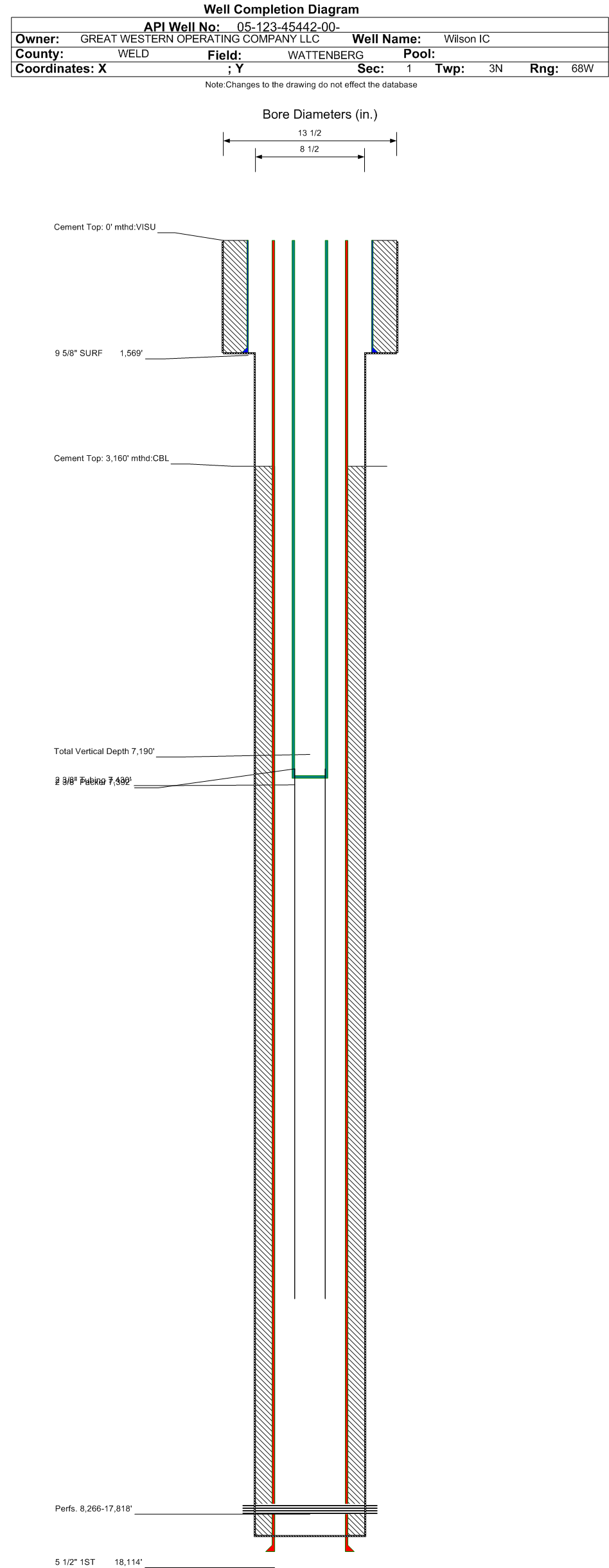 Wellbore #00 Wellbore Classification: OW Status: PR - 8/1/2024 Measured TD: 18114 ft. Vertical TD: 7190 ft.| Wellbore Data for Original Wellbore | Wellbore Classification: OW PR - 8/1/2024 | | Wellbore Permit | HORIZONTAL | | Permit #: | | Expiration Date: | 9/16/2019 | | Proposed Top PZ Location: | Sec:2 Twp: 3N 68W | Footage: 1626 FSL 507 FEL | | Bottom Hole Location: | Sec:3 Twp: 3N 68W | Footage: 1529 FSL 235 FWL | | Proposed Depth/Form: | 17802 ft. | | Surface Mineral Owner Same: | No | | Mineral Owner: | FEE | Surface Owner: | FEE | | Unit: | | Unit Number: | | | Formation And Spacing: | Code: NBRR , Formation: NIOBRARA , Order: , Unit Acreage: 1280, Drill Unit: GWA | | Casing: | String Type: SURF, Hole Size: 13.5 in., Size: 9.625 in., Top: 0 ft., Depth: 1500 ft., Weight: 36 , Citings Type: PLANNED | | Cement: | Sacks: 624, Top: 0 ft., Bottom: 1500 ft. | | Casing: | String Type: 1ST, Hole Size: 8.5 in., Size: 5.5 in., Top: 0 ft., Depth: 17902 ft., Weight: 17 , Citings Type: PLANNED | | Cement: | Sacks: 2283, Top: 0 ft., Bottom: 17902 ft. |