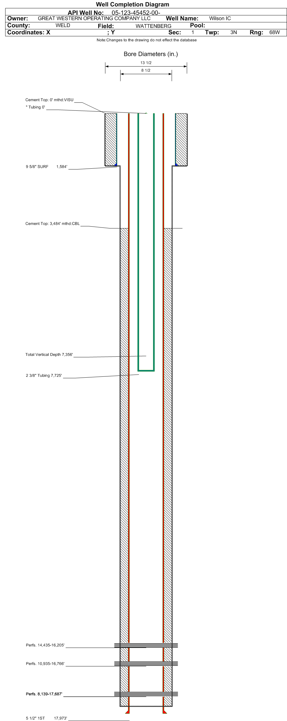 | Wellbore Completed | | Completion Date: | 5/9/2019 | | Spud Date: | 1/2/2019 | Spud Date Is: | ACTUAL | | Measured TD: | 17973 ft. | Measured PB depth: | 17964 ft. | | True Vertical TD: | 7356 ft. | True Vertical PB depth: | 7356 ft. | | Top PZ Location: | Sec:2 Twp: 3N 68W | Footage: 2670 FNL 520 FEL | | Bottom Hole Location: | Sec:3 Twp: 3N 68W | Footage: 2626 FNL 236 FWL | | Log Types: | Mud, MWD/LWD, CBL, Tracer Survey (Composite in 123-45441) | | Casing: | String Type: SURF, Hole Size: 13.5 in., Size: 9.625 in., Top: 0 ft., Depth: 1584 ft., Weight: 36 , Citings Type: ACTUAL | | Cement: | Sacks: 729, Top: 0 ft., Bottom: 1584 ft., Determination Method: VISU | | Casing: | String Type: 1ST, Hole Size: 8.5 in., Size: 5.5 in., Top: 0 ft., Depth: 17973 ft., Weight: 17 , Citings Type: ACTUAL | | Cement: | Sacks: 1975, Top: 3484 ft., Bottom: 17973 ft., Determination Method: CBL | | Formation | Interval Top | Log Bottom | Cored | DSTs | | PARKMAN | 3656 ft. | 3691 ft. | N | N | | SUSSEX | 4133 ft. | 4291 ft. | N | N | | SHANNON | 4653 ft. | 4693 ft. | N | N | | SHARON SPRINGS | 7205 ft. | | N | N | | NIOBRARA | 7392 ft. | | N | N | | FORT HAYS | 7891 ft. | | N | N | | CODELL | 8010 ft. | | N | N |