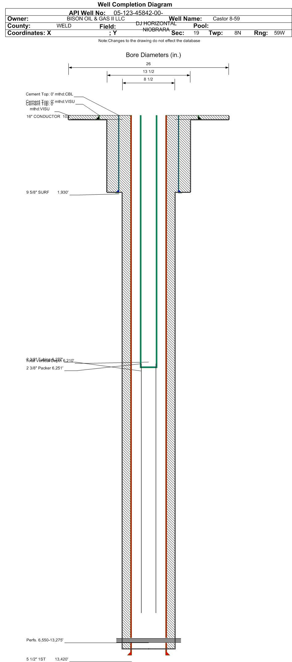 | Wellbore Completed | | Completion Date: | 12/12/2017 | | Spud Date: | 12/7/2017 | Spud Date Is: | ACTUAL | | Measured TD: | 13428 ft. | Measured PB depth: | 13374 ft. | | True Vertical TD: | 6210 ft. | True Vertical PB depth: | 6208 ft. | | Top PZ Location: | Sec:19 Twp: 8N 59W | Footage: 1836 FSL 600 FEL | | Bottom Hole Location: | Sec:24 Twp: 8N 60W | Footage: 1836 FSL 2126 FEL | | Log Types: | MWD/LWD, CBL, Mud, (Resistivity in API 05-123-45855) | | Casing: | String Type: CONDUCTOR, Hole Size: 26 in., Size: 16 in., Top: 0 ft., Depth: 103 ft., Weight: 43 , Citings Type: ACTUAL | | Cement: | Sacks: 270, Top: 0 ft., Bottom: 103 ft., Determination Method: VISU | | Casing: | String Type: SURF, Hole Size: 13.5 in., Size: 9.625 in., Top: 0 ft., Depth: 1930 ft., Weight: 36 , Citings Type: ACTUAL | | Cement: | Sacks: 682, Top: 0 ft., Bottom: 1930 ft., Determination Method: VISU | | Casing: | String Type: 1ST, Hole Size: 8.5 in., Size: 5.5 in., Top: 0 ft., Depth: 13420 ft., Weight: 20 , Citings Type: ACTUAL | | Cement: | Sacks: 1890, Top: 0 ft., Bottom: 13420 ft., Determination Method: CBL | | Formation | Interval Top | Log Bottom | Cored | DSTs | | PARKMAN | 3182 ft. | 3642 ft. | N | | | SUSSEX | 3845 ft. | 3945 ft. | N | | | SHANNON | 4710 ft. | 4910 ft. | N | | | SHARON SPRINGS | 5955 ft. | 6079 ft. | N | | | NIOBRARA | 6079 ft. | | N | |