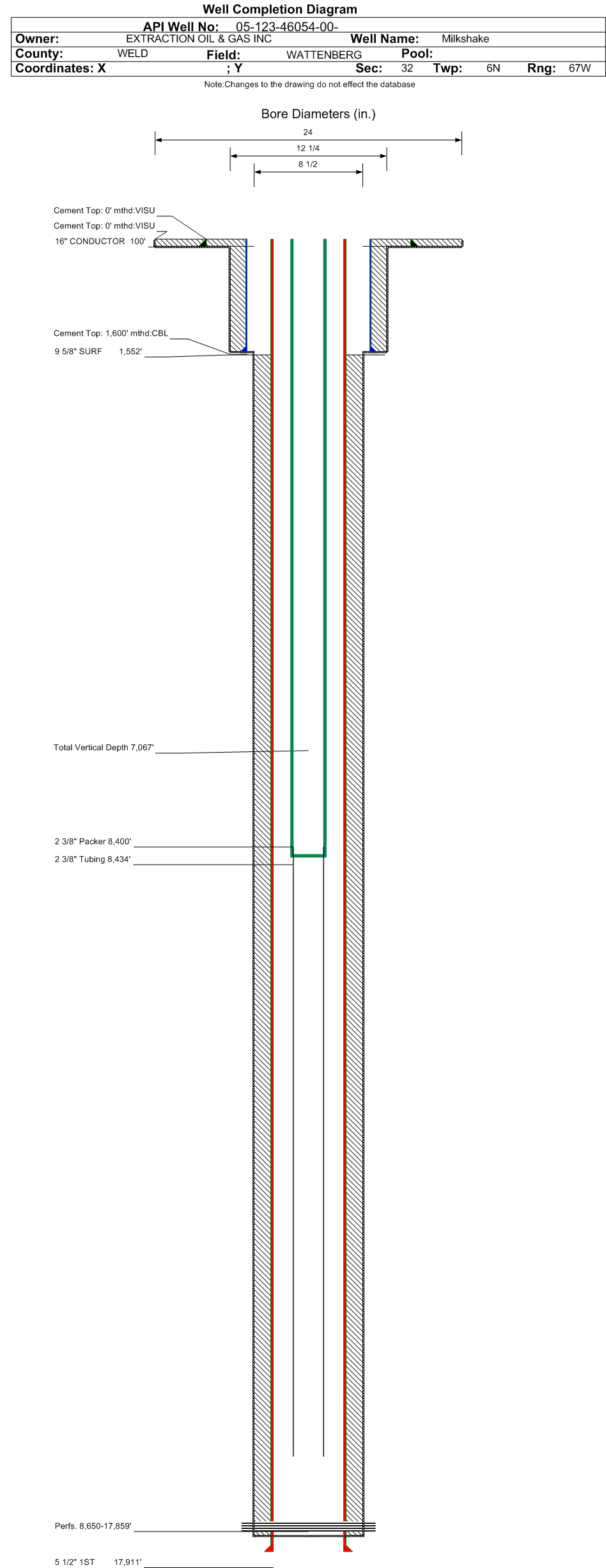Wellbore #00 Wellbore Classification: OW Status: PR - 8/1/2025 Measured TD: 17931 ft. Vertical TD: 7067 ft.| Wellbore Data for Original Wellbore | Wellbore Classification: OW PR - 8/1/2025 | | Wellbore Permit | HORIZONTAL | | Permit #: | | Expiration Date: | 12/14/2019 | | Proposed Top PZ Location: | Sec:31 Twp: 6N 67W | Footage: 186 FNL 460 FEL | | Bottom Hole Location: | Sec:36 Twp: 6N 68W | Footage: 53 FNL 460 FWL | | Proposed Depth/Form: | 17958 ft. | | Surface Mineral Owner Same: | No | | Mineral Owner: | STATE | Surface Owner: | FEE | | Unit: | | Unit Number: | | | Formation And Spacing: | Code: NBRR , Formation: NIOBRARA , Order: , Unit Acreage: 640, Drill Unit: GWA | | Casing: | String Type: CONDUCTOR, Hole Size: 24 in., Size: 16 in., Top: 0 ft., Depth: 80 ft., Weight: 42 , Citings Type: PLANNED | | Cement: | Sacks: 100, Top: 0 ft., Bottom: 80 ft. | | Casing: | String Type: SURF, Hole Size: 12.25 in., Size: 9.625 in., Top: 0 ft., Depth: 1500 ft., Weight: 36 , Citings Type: PLANNED | | Cement: | Sacks: 400, Top: 0 ft., Bottom: 1500 ft. | | Casing: | String Type: 1ST, Hole Size: 8.5 in., Size: 5.5 in., Top: 0 ft., Depth: 17958 ft., Weight: 20 , Citings Type: PLANNED | | Cement: | Sacks: 2398, Top: 1500 ft., Bottom: 17958 ft. |
