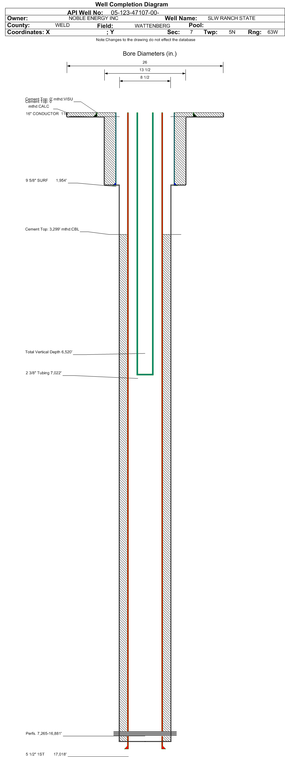 Wellbore #00 Wellbore Classification: OW Status: PR - 12/29/2019 Measured TD: 17032 ft. Vertical TD: 6520 ft.| Wellbore Data for Original Wellbore | Wellbore Classification: OW PR - 12/29/2019 | | Wellbore Permit | HORIZONTAL | | Permit #: | | Expiration Date: | 6/18/2020 | | Proposed Top PZ Location: | Sec:7 Twp: 5N 63W | Footage: 401 FNL 439 FWL | | Bottom Hole Location: | Sec:8 Twp: 5n 63w | Footage: 337 FNL 258 FEL | | Proposed Depth/Form: | 18430 ft. | | Surface Mineral Owner Same: | No | | Mineral Owner: | STATE | Surface Owner: | FEE | | Unit: | | Unit Number: | | | Formation And Spacing: | Code: NBRR , Formation: NIOBRARA , Order: , Unit Acreage: 795, Drill Unit: GWA | | Casing: | String Type: CONDUCTOR, Hole Size: 26 in., Size: 16 in., Top: 0 ft., Depth: 80 ft., Weight: 42 , Citings Type: PLANNED | | Cement: | Sacks: 6, Top: 0 ft., Bottom: 80 ft. | | Casing: | String Type: SURF, Hole Size: 13.5 in., Size: 9.625 in., Top: 0 ft., Depth: 1850 ft., Weight: 36 , Citings Type: PLANNED | | Cement: | Sacks: 685, Top: 0 ft., Bottom: 1850 ft. | | Casing: | String Type: 1ST, Hole Size: 8.5 in., Size: 5.5 in., Top: 0 ft., Depth: 18430 ft., Weight: 20 , Citings Type: PLANNED | | Cement: | Sacks: 2040, Top: , Bottom: 18430 ft. |