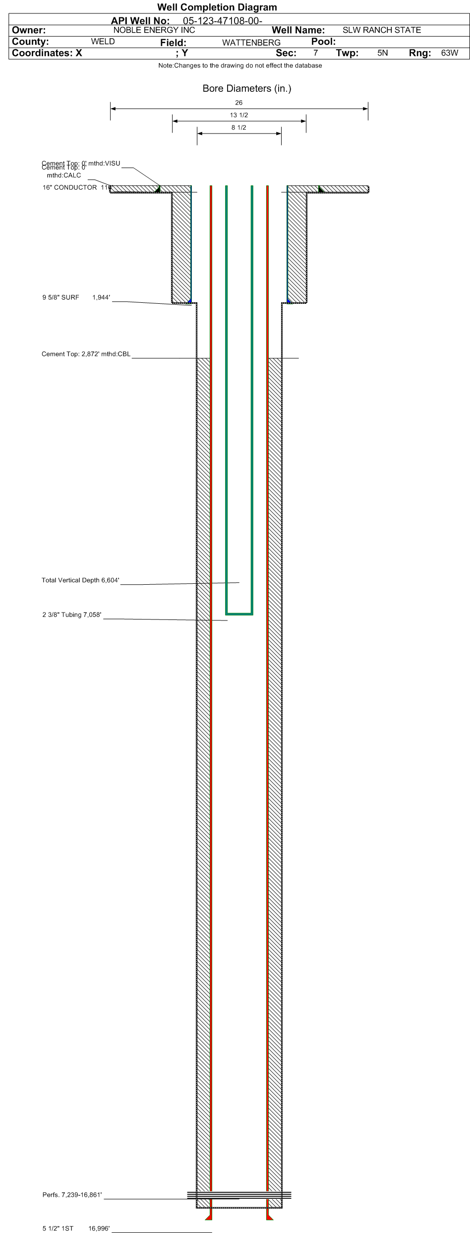 | Wellbore Completed | | Completion Date: | 7/28/2019 | | Spud Date: | 7/14/2019 | Spud Date Is: | ACTUAL | | Measured TD: | 17010 ft. | Measured PB depth: | 16950 ft. | | True Vertical TD: | 6604 ft. | True Vertical PB depth: | 6604 ft. | | Top PZ Location: | Sec:7 Twp: 5N 64W | Footage: 822 FNL 436 FEL | | Bottom Hole Location: | Sec:8 Twp: 5N 63W | Footage: 804 FNL 253 FEL | | Log Types: | CBL, MWD/LWD, (RES in 123-20499) | | Casing: | String Type: CONDUCTOR, Hole Size: 26 in., Size: 16 in., Top: 0 ft., Depth: 110 ft., Weight: 36.94 , Citings Type: ACTUAL | | Cement: | Sacks: 64, Top: 0 ft., Bottom: 110 ft., Determination Method: CALC | | Casing: | String Type: SURF, Hole Size: 13.5 in., Size: 9.625 in., Top: 0 ft., Depth: 1944 ft., Weight: 36 , Citings Type: ACTUAL | | Cement: | Sacks: 662, Top: 0 ft., Bottom: 1944 ft., Determination Method: VISU | | Casing: | String Type: 1ST, Hole Size: 8.5 in., Size: 5.5 in., Top: 0 ft., Depth: 16996 ft., Weight: 17 , Citings Type: ACTUAL | | Cement: | Sacks: 1714, Top: 2872 ft., Bottom: 17010 ft., Determination Method: CBL | | Formation | Interval Top | Log Bottom | Cored | DSTs | | PIERRE | 407 ft. | | | | | PARKMAN | 3492 ft. | | | | | SUSSEX | 4047 ft. | | | | | SHANNON | 4930 ft. | | | | | TEEPEE BUTTES | 5951 ft. | | | | | SHARON SPRINGS | 6675 ft. | | | | | NIOBRARA | 6723 ft. | | | |