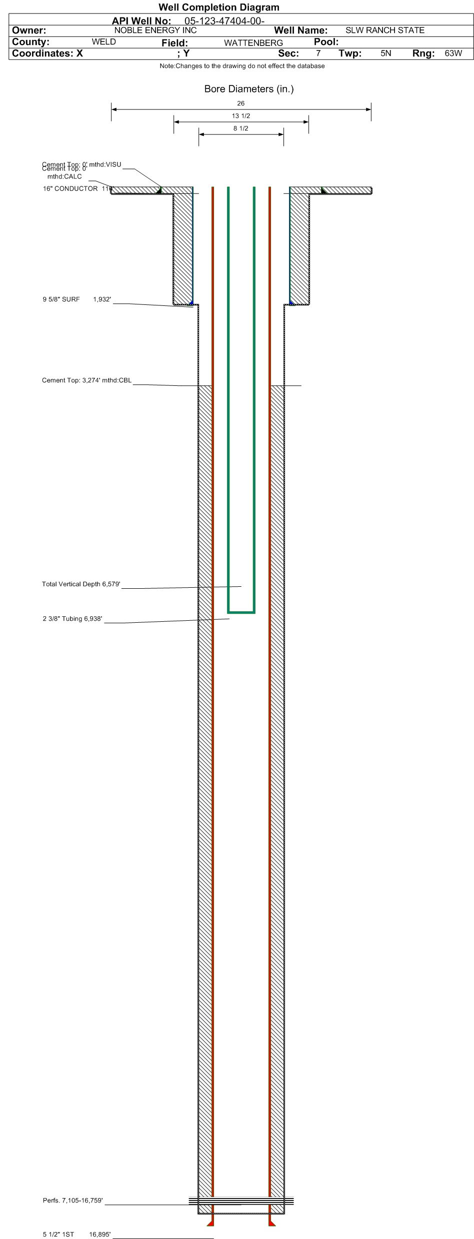Wellbore #00 Wellbore Classification: OW Status: PR - 1/2/2020 Measured TD: 16911 ft. Vertical TD: 6579 ft.| Wellbore Data for Original Wellbore | Wellbore Classification: OW PR - 1/2/2020 | | Wellbore Permit | HORIZONTAL | | Permit #: | | Expiration Date: | 7/22/2020 | | Proposed Top PZ Location: | Sec:7 Twp: 5N 63W | Footage: 1058 FSL 426 FWL | | Bottom Hole Location: | Sec:8 Twp: 5N 63W | Footage: 1095 FSL 252 FEL | | Proposed Depth/Form: | 17673 ft. | | Surface Mineral Owner Same: | No | | Mineral Owner: | FEE | Surface Owner: | FEE | | Unit: | | Unit Number: | | | Formation And Spacing: | Code: NBRR , Formation: NIOBRARA , Order: , Unit Acreage: 795, Drill Unit: GWA | | Casing: | String Type: CONDUCTOR, Hole Size: 26 in., Size: 16 in., Top: 0 ft., Depth: 80 ft., Weight: 42 , Citings Type: PLANNED | | Cement: | Sacks: 6, Top: 0 ft., Bottom: 80 ft. | | Casing: | String Type: SURF, Hole Size: 13.5 in., Size: 9.625 in., Top: 0 ft., Depth: 1850 ft., Weight: 36 , Citings Type: PLANNED | | Cement: | Sacks: 658, Top: 0 ft., Bottom: 1850 ft. | | Casing: | String Type: 1ST, Hole Size: 8.5 in., Size: 5.5 in., Top: 0 ft., Depth: 17673 ft., Weight: 20 , Citings Type: PLANNED | | Cement: | Sacks: 1937, Top: , Bottom: |