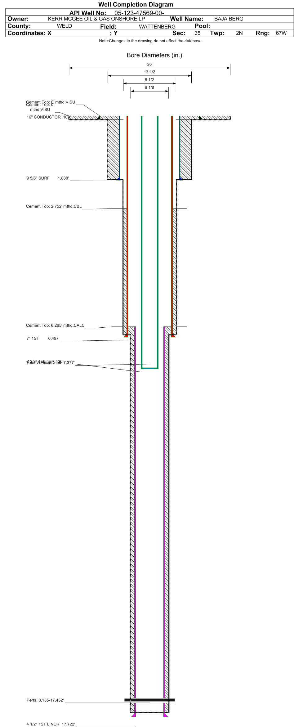 Wellbore #00 Wellbore Classification: OW Status: PR - 12/1/2023 Measured TD: 17726 ft. Vertical TD: 7377 ft.| Wellbore Data for Original Wellbore | Wellbore Classification: OW PR - 12/1/2023 | | Wellbore Permit | HORIZONTAL | | Permit #: | | Expiration Date: | 8/12/2020 | | Proposed Top PZ Location: | Sec:35 Twp: 2N 67W | Footage: 157 FSL 2162 FEL | | Bottom Hole Location: | Sec:31 Twp: 2N 66W | Footage: 60 FSL 2125 FWL | | Proposed Depth/Form: | 17718 ft. | | Surface Mineral Owner Same: | No | | Mineral Owner: | FEE | Surface Owner: | FEE | | Unit: | | Unit Number: | | | Formation And Spacing: | Code: NBRR , Formation: NIOBRARA , Order: , Unit Acreage: 720, Drill Unit: GWA | | Casing: | String Type: CONDUCTOR, Hole Size: 26 in., Size: 16 in., Top: 0 ft., Depth: 80 ft., Weight: 36.94 , Citings Type: PLANNED | | Cement: | Sacks: 64, Top: 0 ft., Bottom: 80 ft. | | Casing: | String Type: SURF, Hole Size: 13.5 in., Size: 9.625 in., Top: 0 ft., Depth: 1500 ft., Weight: 36 , Citings Type: PLANNED | | Cement: | Sacks: 590, Top: 0 ft., Bottom: 1500 ft. | | Casing: | String Type: 1ST, Hole Size: 7.875 in., Size: 5.5 in., Top: 0 ft., Depth: 17708 ft., Weight: 17 , Citings Type: PLANNED | | Cement: | Sacks: 2099, Top: , Bottom: 17708 ft. |