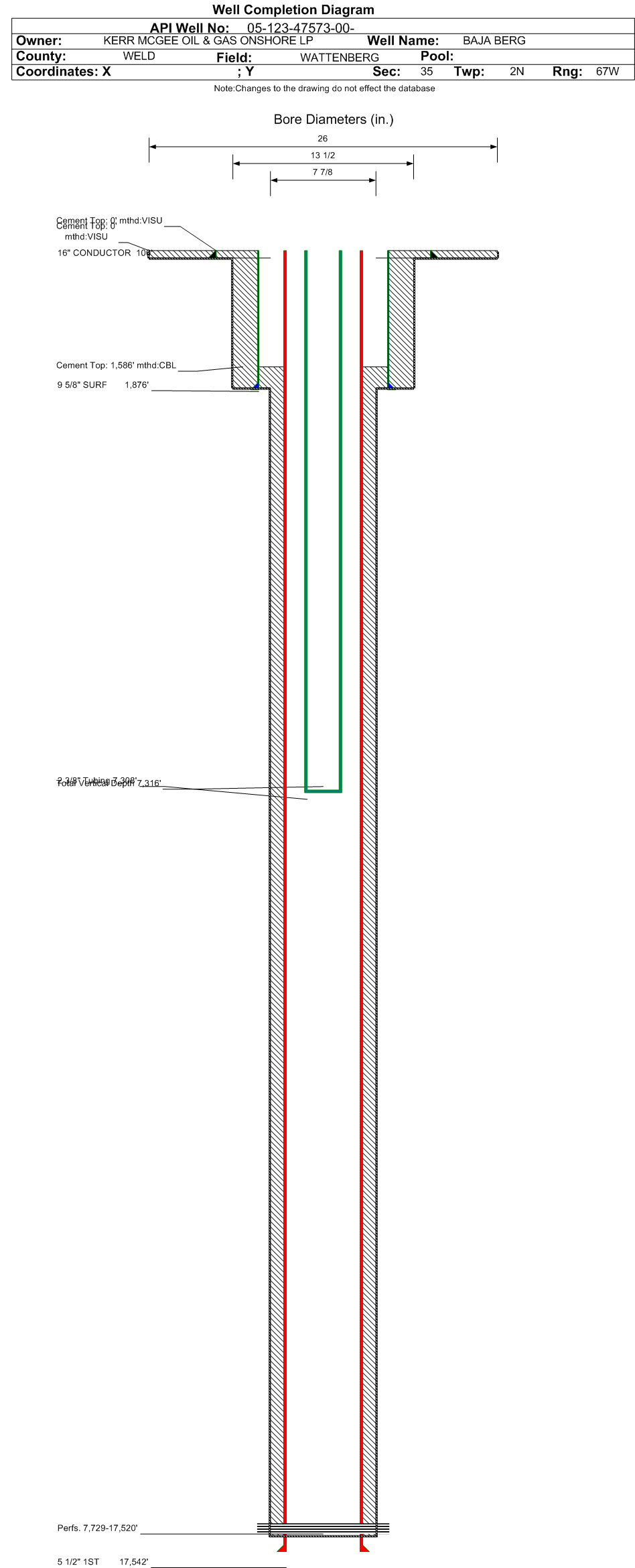 | Wellbore Completed | | Completion Date: | 1/11/2019 | | Spud Date: | 9/18/2018 | Spud Date Is: | ACTUAL | | Measured TD: | 17555 ft. | Measured PB depth: | 17539 ft. | | True Vertical TD: | 7316 ft. | True Vertical PB depth: | 7316 ft. | | Top PZ Location: | Sec:35 Twp: 2N 67W | Footage: 1560 FSL 2428 FEL | | Bottom Hole Location: | Sec:31 Twp: 2N 66W | Footage: 1551 FSL 2111 FWL | | Log Types: | CBL, MWD/LWD. (GR/CNL in API 123-47586). | | Casing: | String Type: CONDUCTOR, Hole Size: 26 in., Size: 16 in., Top: 0 ft., Depth: 100 ft., Weight: 42 , Citings Type: ACTUAL | | Cement: | Sacks: 64, Top: 0 ft., Bottom: 100 ft., Determination Method: VISU | | Casing: | String Type: SURF, Hole Size: 13.5 in., Size: 9.625 in., Top: 0 ft., Depth: 1876 ft., Weight: 36 , Citings Type: ACTUAL | | Cement: | Sacks: 701, Top: 0 ft., Bottom: 1876 ft., Determination Method: VISU | | Casing: | String Type: 1ST, Hole Size: 7.875 in., Size: 5.5 in., Top: 0 ft., Depth: 17542 ft., Weight: 17 , Citings Type: ACTUAL | | Cement: | Sacks: 1670, Top: 1586 ft., Bottom: 17555 ft., Determination Method: CBL | | Formation | Interval Top | Log Bottom | Cored | DSTs | | FOX HILLS | 1253 ft. | | | | | PARKMAN | 4146 ft. | | | | | SUSSEX | 4494 ft. | | | | | SHARON SPRINGS | 7340 ft. | | | | | NIOBRARA | 7477 ft. | | | |