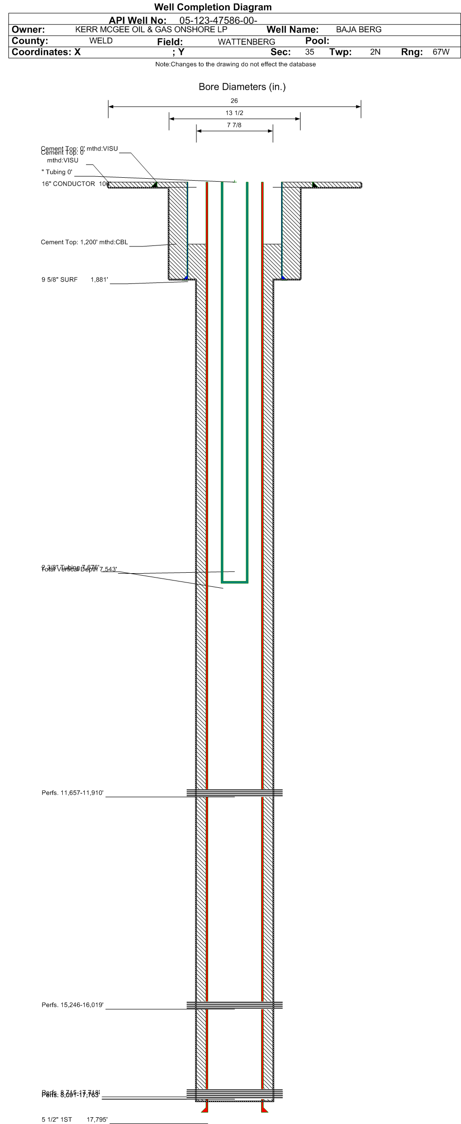 | Wellbore Completed | | Completion Date: | 1/1/2019 | | Spud Date: | 9/18/2018 | Spud Date Is: | ACTUAL | | Measured TD: | 17807 ft. | Measured PB depth: | 17791 ft. | | True Vertical TD: | 7543 ft. | True Vertical PB depth: | 7543 ft. | | Top PZ Location: | Sec:35 Twp: 2N 67W | Footage: 2367 FSL 2363 FEL | | Bottom Hole Location: | Sec:31 Twp: 2N 66W | Footage: 2358 FSL 2103 FWL | | Log Types: | CBL, MWD/LWD, GR/CNL | | Casing: | String Type: CONDUCTOR, Hole Size: 26 in., Size: 16 in., Top: 0 ft., Depth: 100 ft., Weight: 42 , Citings Type: ACTUAL | | Cement: | Sacks: 64, Top: 0 ft., Bottom: 100 ft., Determination Method: VISU | | Casing: | String Type: SURF, Hole Size: 13.5 in., Size: 9.625 in., Top: 0 ft., Depth: 1881 ft., Weight: 36 , Citings Type: ACTUAL | | Cement: | Sacks: 703, Top: 0 ft., Bottom: 1881 ft., Determination Method: VISU | | Casing: | String Type: 1ST, Hole Size: 7.875 in., Size: 5.5 in., Top: 0 ft., Depth: 17795 ft., Weight: 17 , Citings Type: ACTUAL | | Cement: | Sacks: 1700, Top: 1200 ft., Bottom: 17807 ft., Determination Method: CBL | | Formation | Interval Top | Log Bottom | Cored | DSTs | | FOX HILLS | 1256 ft. | | | | | PARKMAN | 4186 ft. | | | | | SUSSEX | 4534 ft. | | | | | SHARON SPRINGS | 7326 ft. | | | | | NIOBRARA | 7408 ft. | | | | | FORT HAYS | 7968 ft. | | | | | CODELL | 8061 ft. | | | | | CARLILE | 15368 ft. | | | |
