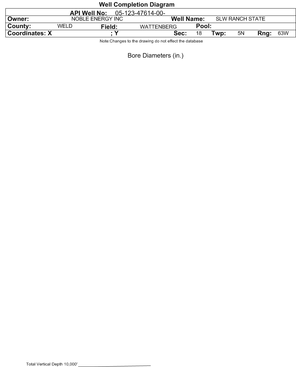 Wellbore #00 Wellbore Classification: OW Status: PR - 5/1/2025 Measured TD: 15214 ft. Vertical TD: 6579 ft.| Wellbore Data for Original Wellbore | Wellbore Classification: OW PR - 5/1/2025 | | Wellbore Permit | HORIZONTAL | | Permit #: | | Expiration Date: | 4/9/2026 | | Proposed Top PZ Location: | Sec:13 Twp: 5N 64W | Footage: 1775 FNL 100 FEL | | Bottom Hole Location: | Sec:14 Twp: 5N 64W | Footage: 1800 FNL 2182 FWL | | Proposed Depth/Form: | 15140 ft. | | Surface Mineral Owner Same: | No | | Mineral Owner: | FEE | Surface Owner: | FEE | | Unit: | | Unit Number: | | | Formation And Spacing: | Code: NBRR , Formation: NIOBRARA , Order: 407-3425 , Unit Acreage: 720, Drill Unit: 5N-63W-18: W/2NW/4; | | Casing: | String Type: CONDUCTOR, Hole Size: 26 in., Size: 16 in., Top: 0 ft., Depth: 110 ft., Weight: 36.94 , Citings Type: PLANNED | | Cement: | Sacks: 60, Top: 0 ft., Bottom: 110 ft. | | Casing: | String Type: SURF, Hole Size: 13.5 in., Size: 9.625 in., Top: 0 ft., Depth: 1980 ft., Weight: 36 , Citings Type: PLANNED | | Cement: | Sacks: 674, Top: 0 ft., Bottom: 1980 ft. | | Casing: | String Type: 1ST, Hole Size: 8.5 in., Size: 5.5 in., Top: 0 ft., Depth: 15140 ft., Weight: 17 , Citings Type: PLANNED | | Cement: | Sacks: 1759, Top: , Bottom: 15140 ft. |