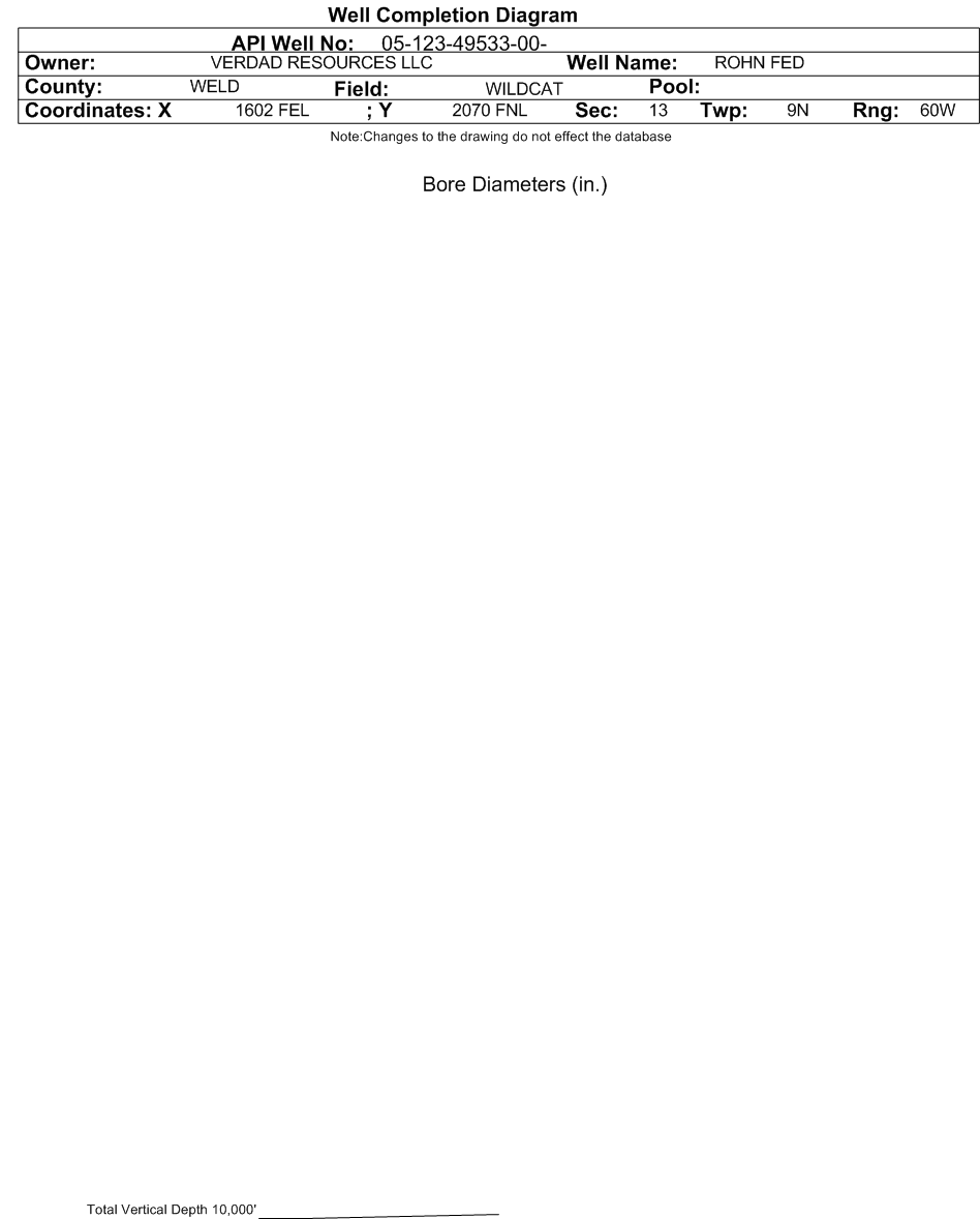 | Wellbore Completed | | Completion Date: | 9/22/2022 | | Spud Date: | 8/24/2022 | Spud Date Is: | ACTUAL | | Measured TD: | 14339 ft. | Measured PB depth: | 14253 ft. | | True Vertical TD: | 6296 ft. | True Vertical PB depth: | 6296 ft. | | Top PZ Location: | Sec:13 Twp: 9N 60W | Footage: 2310 FSL 2299 FWL | | Bottom Hole Location: | Sec:24 Twp: 9N 60W | Footage: 194 FSL 2314 FWL | | Log Types: | MWD/LWD, CBL, RES run on Rohn Fed 1324 16H API 05-123-49539-00 | | Casing: | String Type: CONDUCTOR, Hole Size: 26 in., Size: 16 in., Top: 0 ft., Depth: 80 ft., Weight: 65 , Citings Type: ACTUAL | | Cement: | Sacks: 90, Top: 0 ft., Bottom: 80 ft., Determination Method: VISU | | Casing: | String Type: SURF, Hole Size: 13.5 in., Size: 9.625 in., Top: 0 ft., Depth: 1761 ft., Weight: 36 , Citings Type: ACTUAL | | Cement: | Sacks: 797, Top: 0 ft., Bottom: 1761 ft., Determination Method: VISU | | Casing: | String Type: 1ST, Hole Size: 8.5 in., Size: 5.5 in., Top: 0 ft., Depth: 14339 ft., Weight: 20 , Citings Type: ACTUAL | | Cement: | Sacks: 2145, Top: 945 ft., Bottom: 14339 ft., Determination Method: CBL | | Formation | Interval Top | Log Bottom | Cored | DSTs | | FOX HILLS BASE | 0 ft. | 651 ft. | | | | PIERRE | 1181 ft. | | | | | PARKMAN | 3568 ft. | | | | | SUSSEX | 4135 ft. | | | | | SHANNON | 4594 ft. | | | | | SHARON SPRINGS | 6423 ft. | | | | | NIOBRARA | 6486 ft. | | | |