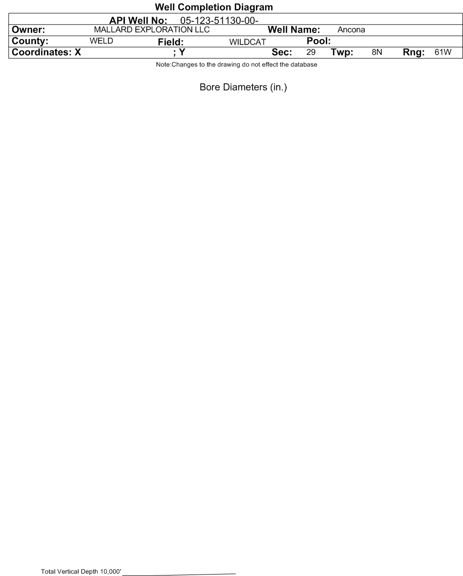 Wellbore #00 Wellbore Classification: Status: PR - 4/1/2024 Measured TD: | Wellbore Data for Original Wellbore | Wellbore Classification: PR - 4/1/2024 | | Wellbore Permit | HORIZONTAL | | Permit #: | | Expiration Date: | 12/16/2024 | | Proposed Top PZ Location: | Sec:28 Twp: 8N 61W | Footage: 2356 FNL 305 FWL | | Bottom Hole Location: | Sec:16 Twp: 8N 61W | Footage: 300 FNL 305 FWL | | Proposed Depth/Form: | 19756 ft. | | Surface Mineral Owner Same: | No | | Mineral Owner: | FEE | Surface Owner: | FEE | | Unit: | | Unit Number: | | | Formation And Spacing: | Code: NBRR , Formation: NIOBRARA , Order: 535-1363 , Unit Acreage: 1600, Drill Unit: Sec 28: N/2; Sec 16: | | Casing: | String Type: CONDUCTOR, Hole Size: 26 in., Size: 16 in., Top: 0 ft., Depth: 80 ft., Weight: 43 , Citings Type: PLANNED | | Cement: | Sacks: 50, Top: 0 ft., Bottom: 80 ft. | | Casing: | String Type: SURF, Hole Size: 13.5 in., Size: 9.625 in., Top: 0 ft., Depth: 1900 ft., Weight: 36 , Citings Type: PLANNED | | Cement: | Sacks: 755, Top: 0 ft., Bottom: 1900 ft. | | Casing: | String Type: 1ST, Hole Size: 8.5 in., Size: 5.5 in., Top: 0 ft., Depth: 19756 ft., Weight: 20 , Citings Type: PLANNED | | Cement: | Sacks: 2187, Top: 1700 ft., Bottom: 19756 ft. |