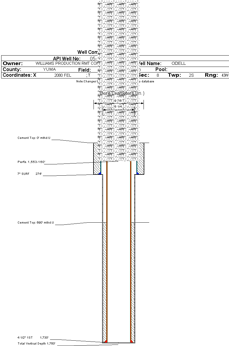 | Wellbore Completed | | Completion Date: | 3/18/1997 | | Spud Date: | 2/4/1997 | Spud Date Is: | ACTUAL | | Measured TD: | 1750 ft. | Measured PB depth: | 1715 ft. | | True Vertical TD: | 1750 ft. | True Vertical PB depth: | 1715 ft. | | Log Types: | INDUCTION, DENSITY/NEUTRON, GAMMA RAY, CBL | | Casing: | String Type: SURF, Hole Size: 9.875 in., Size: 7 in., Top: 0 ft., Depth: 274 ft., Weight: 20 , Citings Type: ACTUAL | | Cement: | Sacks: 125, Top: 0 ft., Bottom: 274 ft., Determination Method: CALC | | Casing: | String Type: 1ST, Hole Size: 6.25 in., Size: 4.5 in., Top: 0 ft., Depth: 1730 ft., Weight: 10.5 , Citings Type: ACTUAL | | Cement: | Sacks: 100, Top: 690 ft., Bottom: 1730 ft., Determination Method: CBL | | Formation | Interval Top | Log Bottom | Cored | DSTs | | NIOBRARA | 1553 ft. | | N | N |