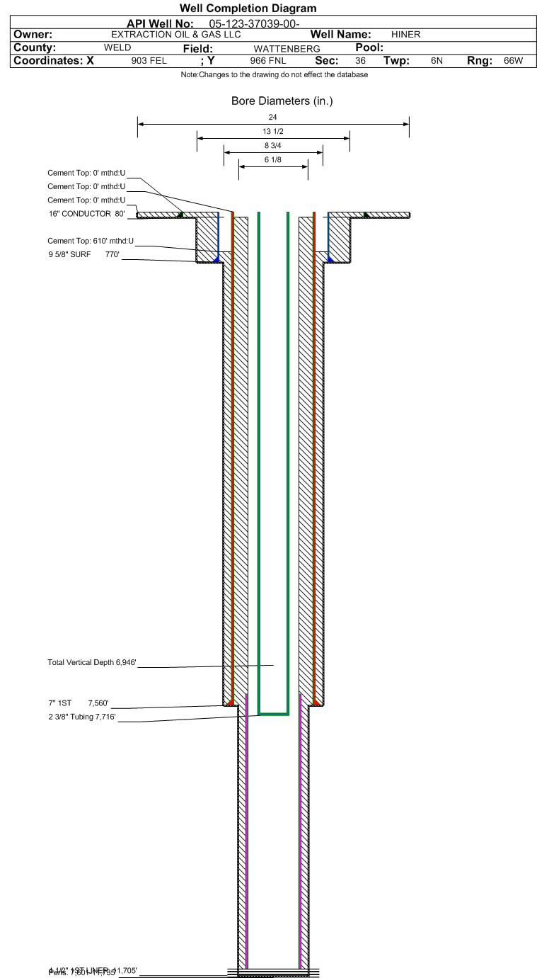 Wellbore #00 Wellbore Classification: OW Status: PR - 1/1/2025 Measured TD: 11737 ft. Vertical TD: 6946 ft.| Wellbore Data for Original Wellbore | Wellbore Classification: OW PR - 1/1/2025 | | Wellbore Permit | HORIZONTAL | | Permit #: | | Expiration Date: | 3/18/2015 | | Proposed Top PZ Location: | Sec:36 Twp: 6N 66W | Footage: 1477 FNL 648 FEL | | Bottom Hole Location: | Sec:36 Twp: 6N 66W | Footage: 1499 FNL 504 FWL | | Proposed Depth/Form: | 7242 ft. | | Surface Mineral Owner Same: | Yes | | Mineral Owner: | FEE | Surface Owner: | FEE | | Unit: | | Unit Number: | | | Formation And Spacing: | Code: CODL , Formation: CODELL , Order: 381-17 , Unit Acreage: 160, Drill Unit: NE/4 | | Formation And Spacing: | Code: NBRR , Formation: NIOBRARA , Order: , Unit Acreage: 320, Drill Unit: GWA | | Casing: | String Type: SURF, Hole Size: 12.25 in., Size: 9.625 in., Top: 0 ft., Depth: 750 ft., Weight: 36 , Citings Type: PLANNED | | Cement: | Sacks: 360, Top: 0 ft., Bottom: 750 ft. | | Casing: | String Type: 1ST, Hole Size: 8.75 in., Size: 7 in., Top: 0 ft., Depth: 7600 ft., Weight: 26 , Citings Type: PLANNED | | Cement: | Sacks: 925, Top: 0 ft., Bottom: 7600 ft. | | Casing: | String Type: 1ST LINER, Hole Size: 6.125 in., Size: 4.5 in., Top: 7500 ft., Depth: 11673 ft., Weight: 13.5 , Citings Type: PLANNED | | Cement: | Sacks: 0, Top: 0 ft., Bottom: |